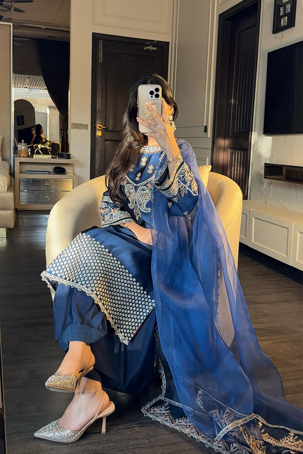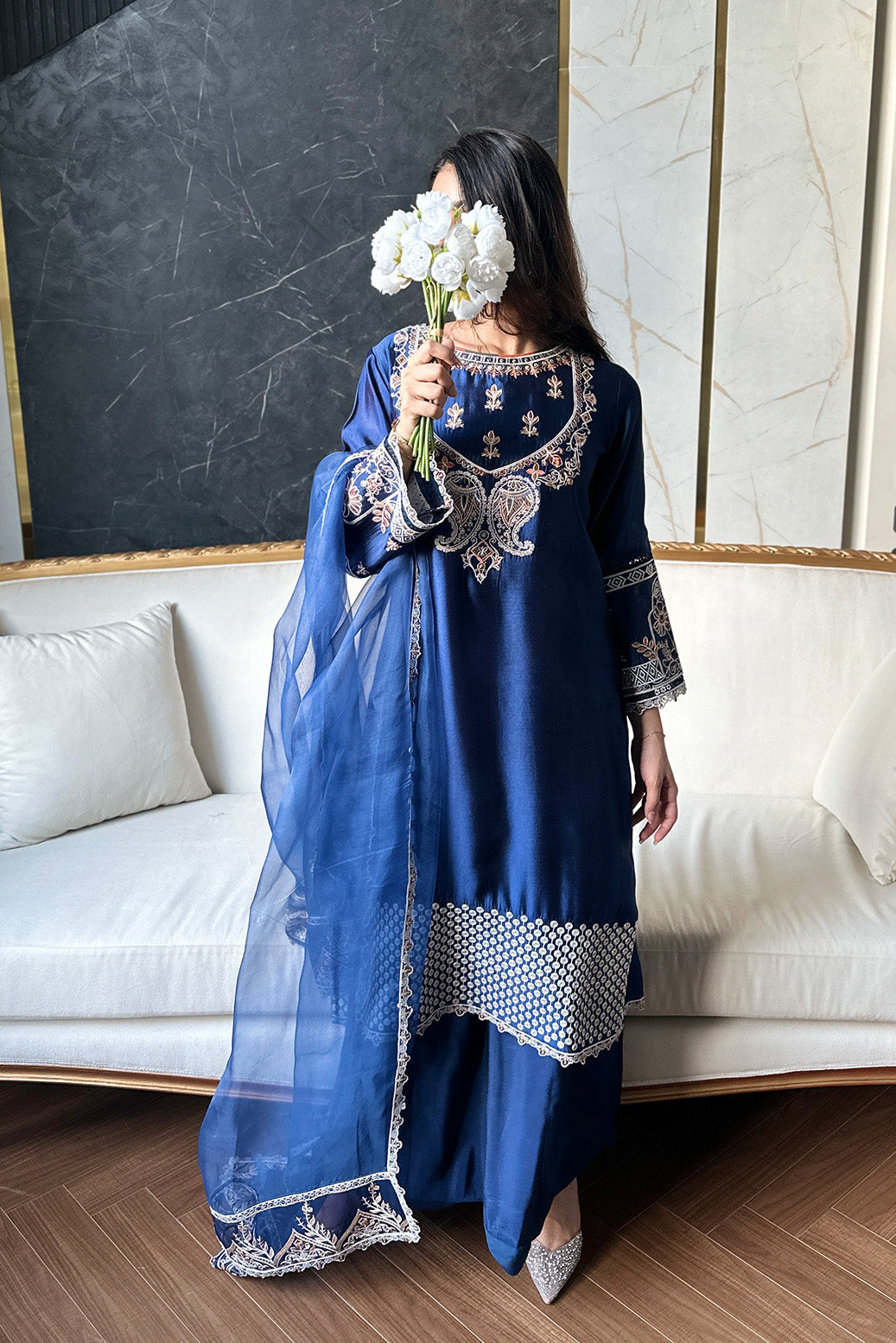 Description 3 Piece Ready-to-wear By Tawakkal Fabrics, Luxury & Elegant Festive Khaas Collection comes with: Stitched Fancy Embroidered Velvet Shirt Design with dabka Handwork Fancy Embroidered Pure Organza Dupatta with Four side Cutwork Stitched Fancy Pure Sheesha Silk Trouser with Velvet Detailing (5 Different Sizes: X-Small,...